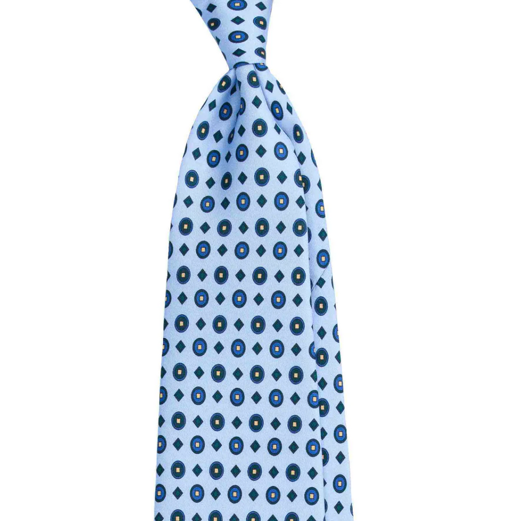 The light blue silk tie, enriched with a crisp green geometric motif, offers a contemporary yet understated charm—perfect for brightening spring tailoring or adding freshness to navy suiting. The blue silk tie, punctuated by scattered yellow and light blue circles, brings a polished vibrancy ideal for both business settings and weekend occasions. Completing the trio, the green silk tie features refined light blue and yellow square motifs, giving a bold but balanced accent to classic ensembles.