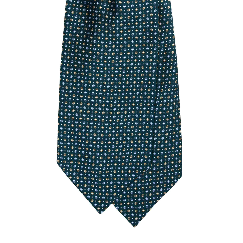 Elegant and distinctive, this green silk ascot scarf features a refined geometric micropattern in light blue and yellow, adding depth and sophistication to its rich base color. Handcrafted in Italy from 100% Como silk, it reflects the heritage of Italian artistry and the unmistakable quality of luxury silk accessories.