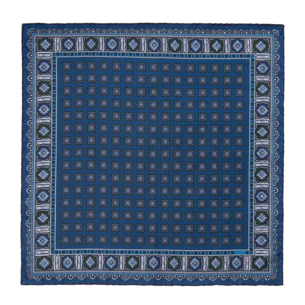 The Aida Pocket Square, a tribute to Italian opera culture, features deep blues and geometric motifs that add structure and richness to any ensemble.