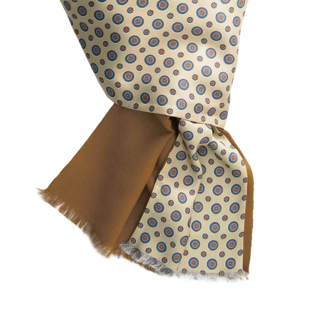 Handcrafted in Italy, this silk and wool scarf is designed to transition seamlessly from daytime sophistication to evening refinement. The harmonious blend of cream, camel, blue, and terracotta offers exceptional versatility — a palette that complements both classic tailoring and relaxed weekend looks.