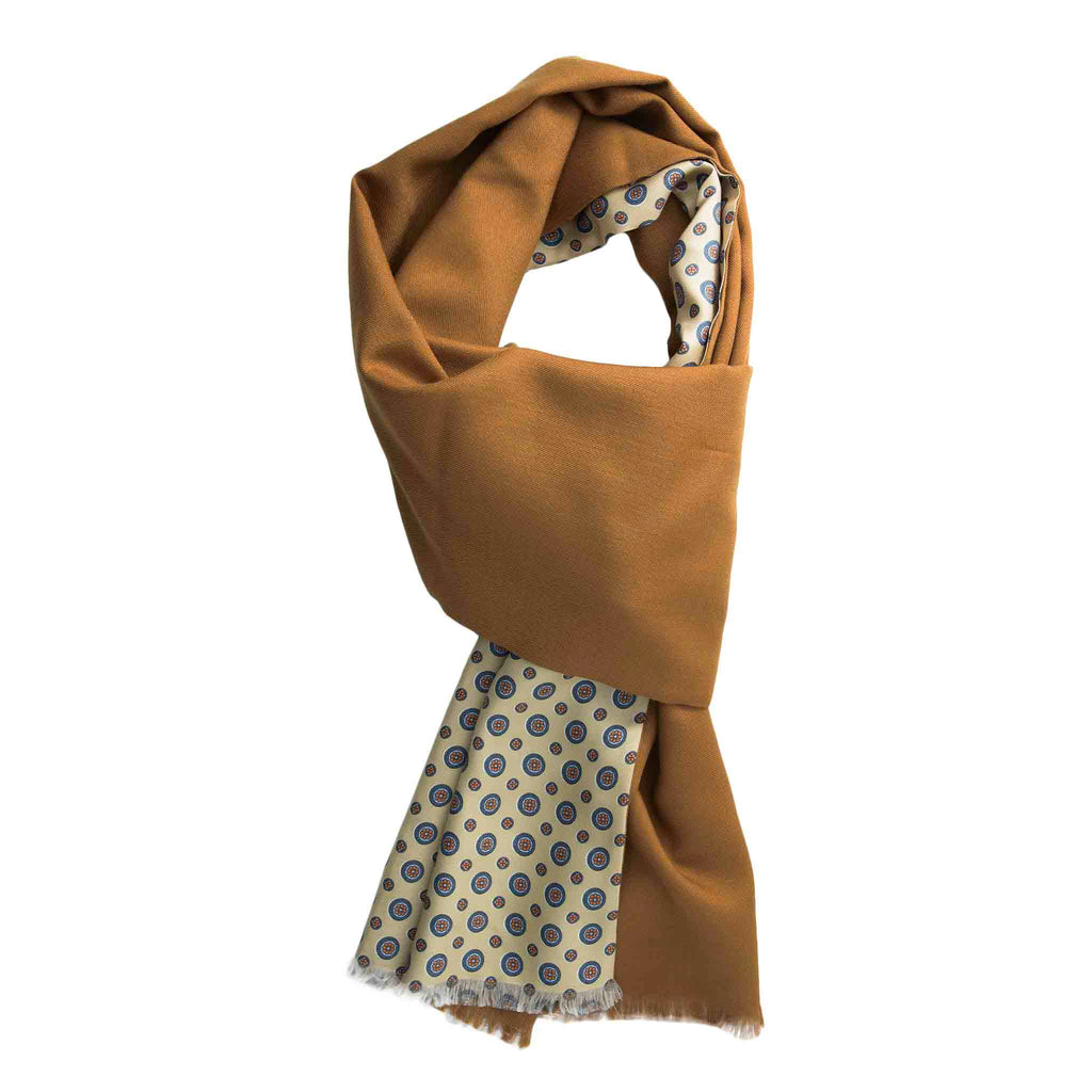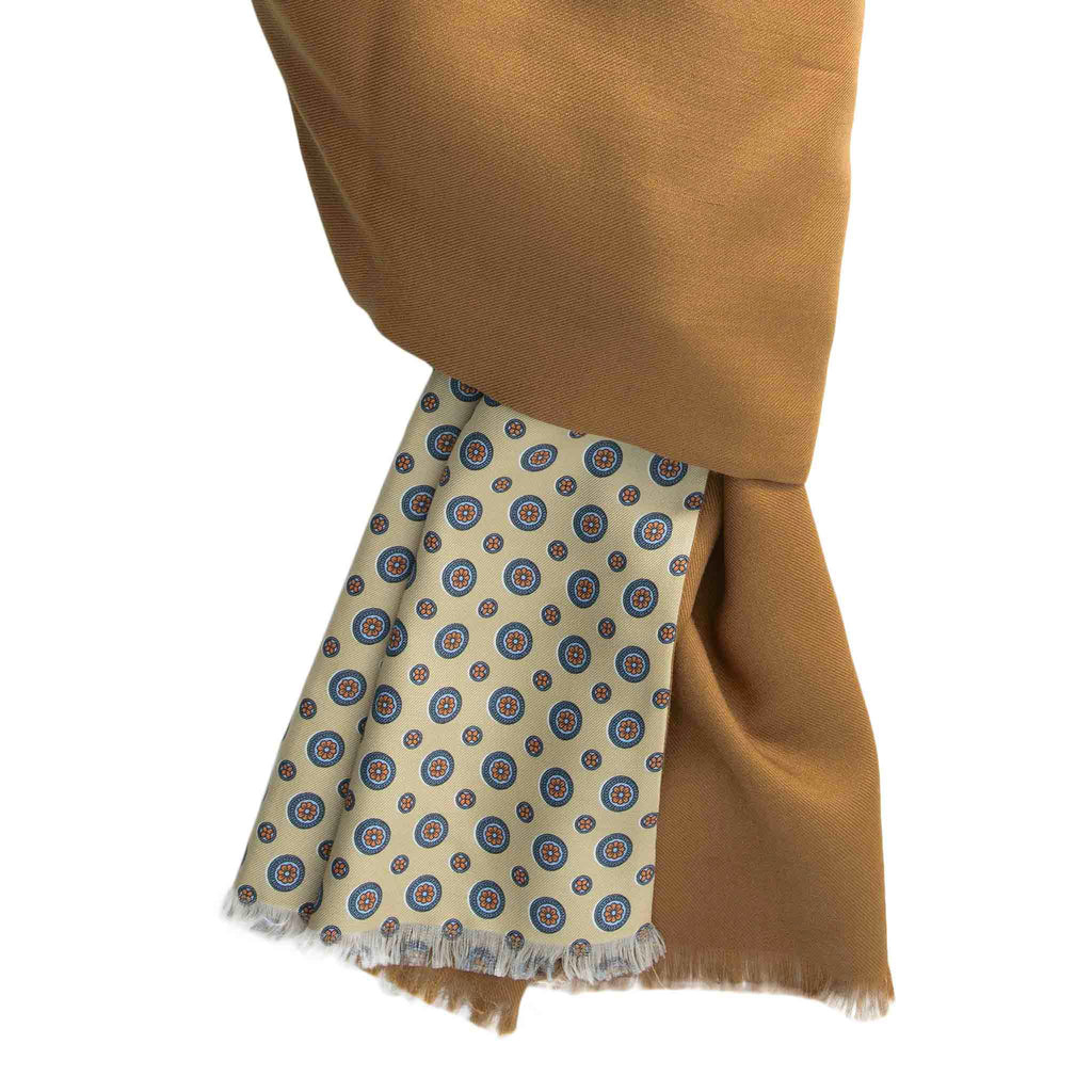 The Cream and Camel Geometric Wool Scarf embodies the understated elegance of Italian craftsmanship, combining the refined sheen of 100% Como silk with the enveloping warmth of pure wool. The silk side showcases a delicate geometric micropattern in soft blue and warm terracotta tones against an ivory background, creating a subtle yet distinguished visual texture. The reverse, crafted in smooth camel-colored cashmere, adds a layer of comfort and luxury ideal for cooler days.